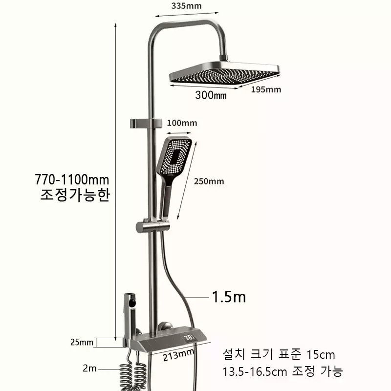 Sugerencia de instalación: la distancia de instalación de la entrada de agua es de 15cm, que se puede ajustar de 13,5 a 16,5 cm. Se recomienda que la distancia entre la entrada de agua y el suelo sea de 90-110cm. El agua caliente izquierda y derecha no afecta el uso. La presión de agua recomendada es 0,2-0.6MPA. Si es inferior a 0,2-0.6MPA, la pantalla digital no puede funcionar normalmente.