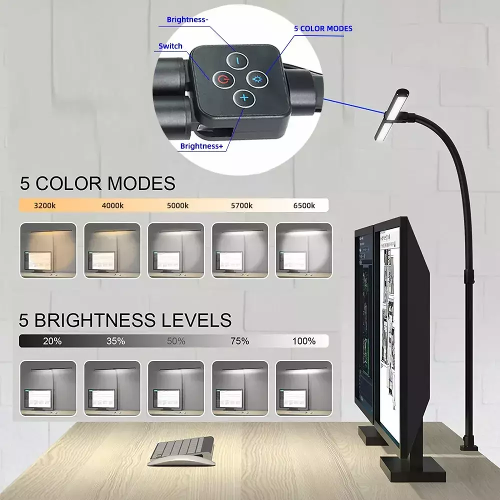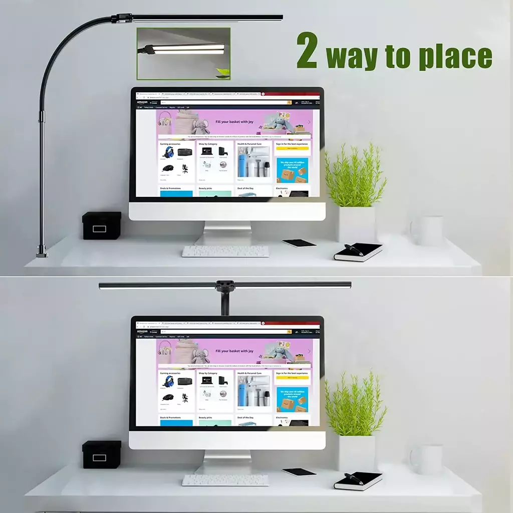 • Clip doble de la cabeza LED :El diseño de doble cabezal permite una gama más amplia de cobertura de iluminación, lo que lo hace perfecto para escritorios o estaciones de trabajo con múltiples monitores.