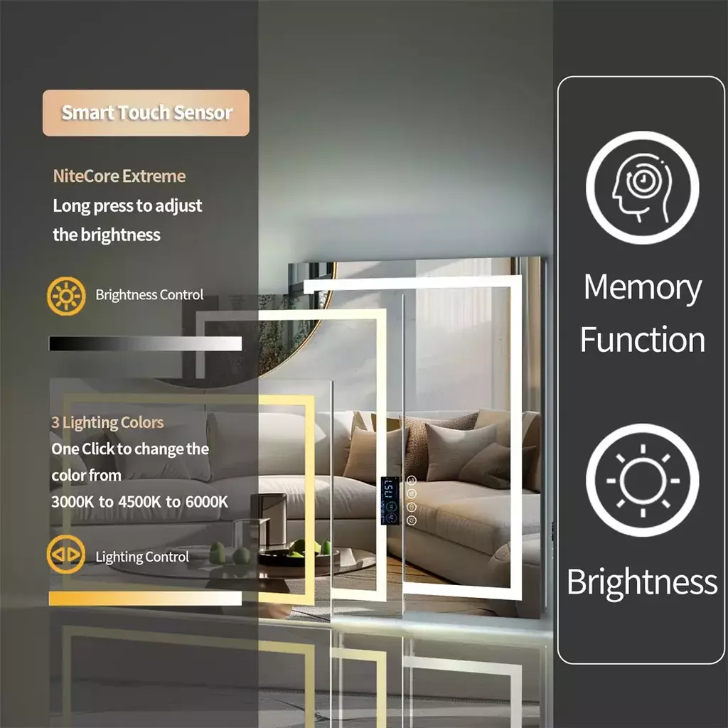 ?Sistema antivaho y función de memoria? El smartmirror cuenta con función de memoria, lo que significa que cuando encienda el interruptor, el espejo restaurará la iluminación y el brillo del último uso, ahorrará tiempo, no es necesario reajustar las luces de nuevo, luego las almohadillas antivaho incorporadas eliminan grandes manchas de vapor en su espejo, Funciona en 3-4 minutos al ducharse, mantiene el espejo libre de niebla y siempre imágenes claras, cuatro botones en la pantalla para controlar de forma independiente el encendido/apagado y el brillo, los colores de iluminación, sistema de desempañado y música