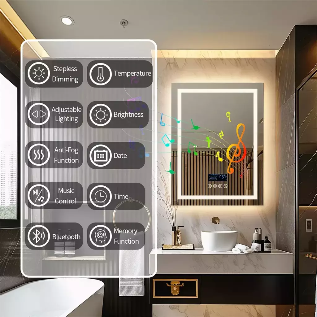 ?Altavoz Bluetooth? Integra la conectividad Bluetooth y el altavoz NdFeB en este espejo de baño iluminado, y más comodidad que ofrece flexibilidad, permitiendo a los usuarios transmitir música o podcasts favoritos desde teléfonos inteligentes cuando se bañan, creando un ambiente más agradable y Ambiente relajante, altavoces NdFeB proporcionan una calidad de audio de alto rendimiento, producen un sonido claro sin ruido, mejora la experiencia auditiva de los usuarios, el espejo combina la funcionalidad de un espejo tradicional con la comodidad de la transmisión de audio Bluetooth