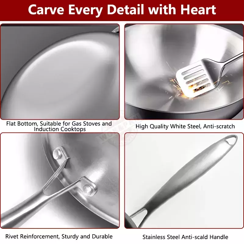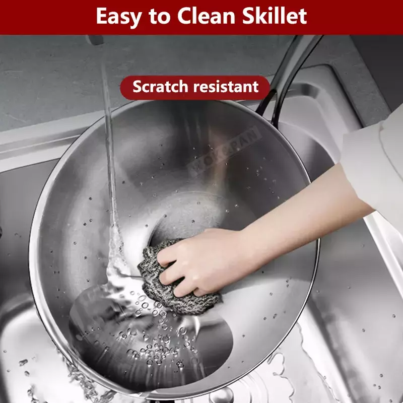 ?Buena distribución del calor?Fabricada con acero inoxidable revestido de tres capas de alta calidad con excelente conducción del calor y calentamiento uniforme, la sartén de acero inoxidable también ayuda en la distribución del calor, menos tiempo de cocción y los alimentos queman mucho menos.