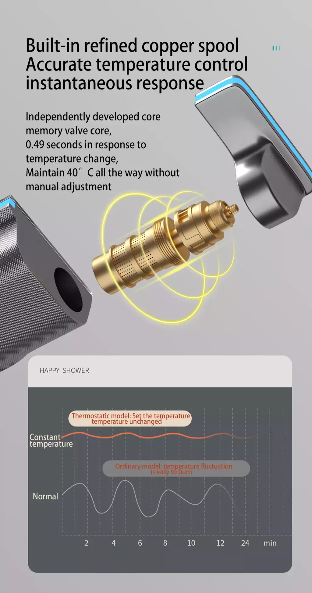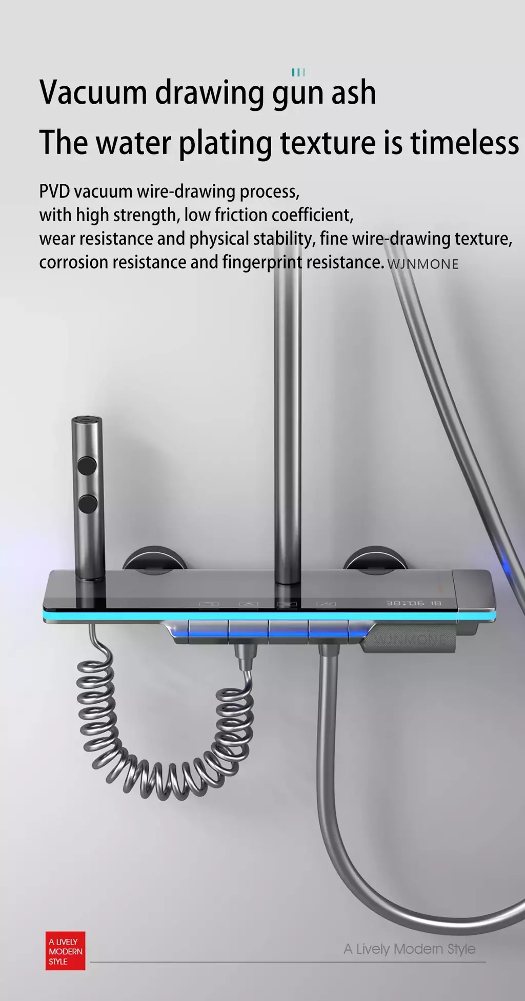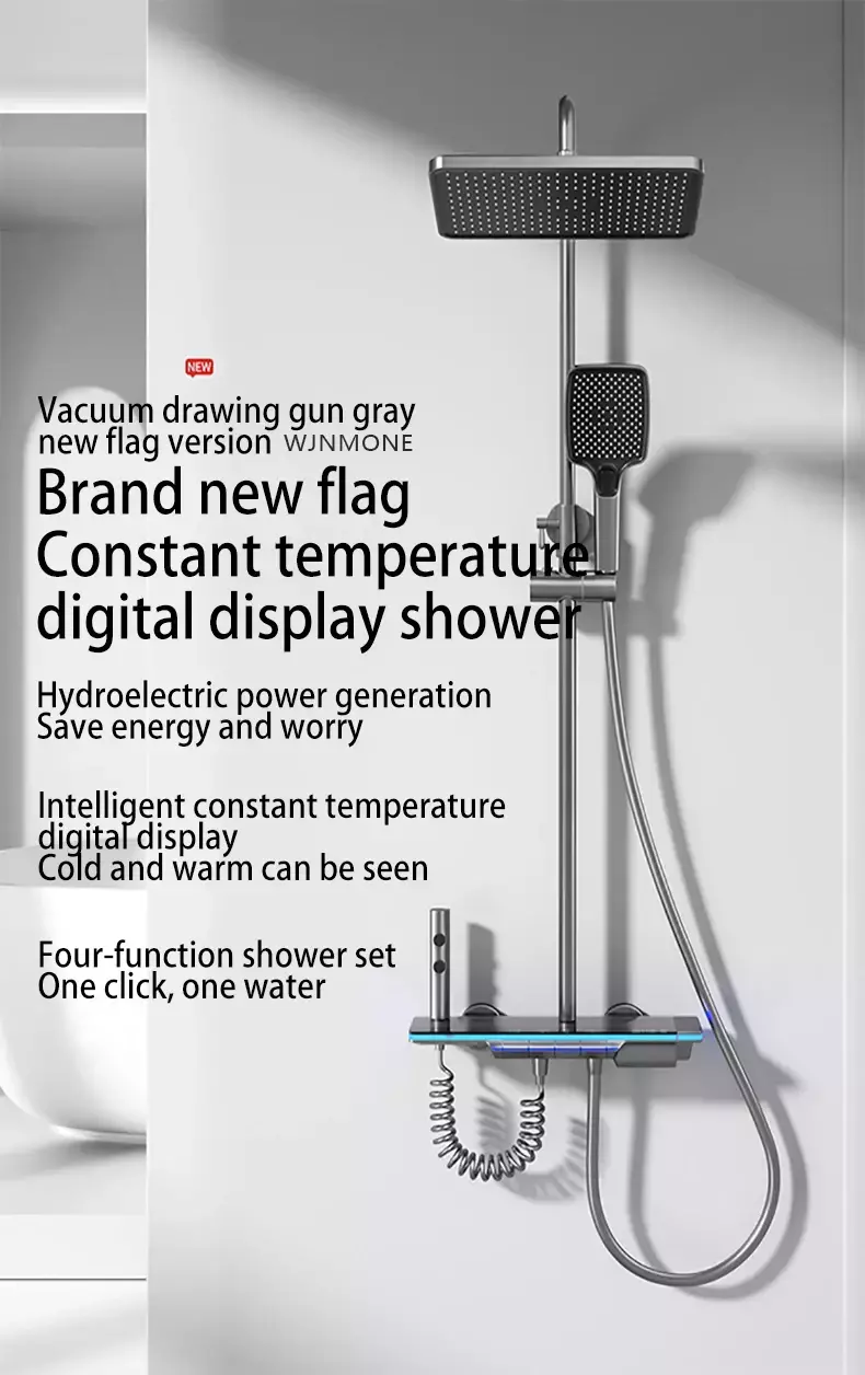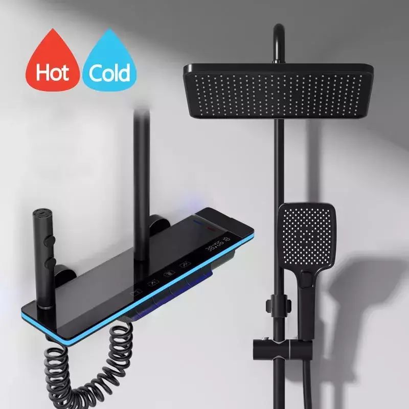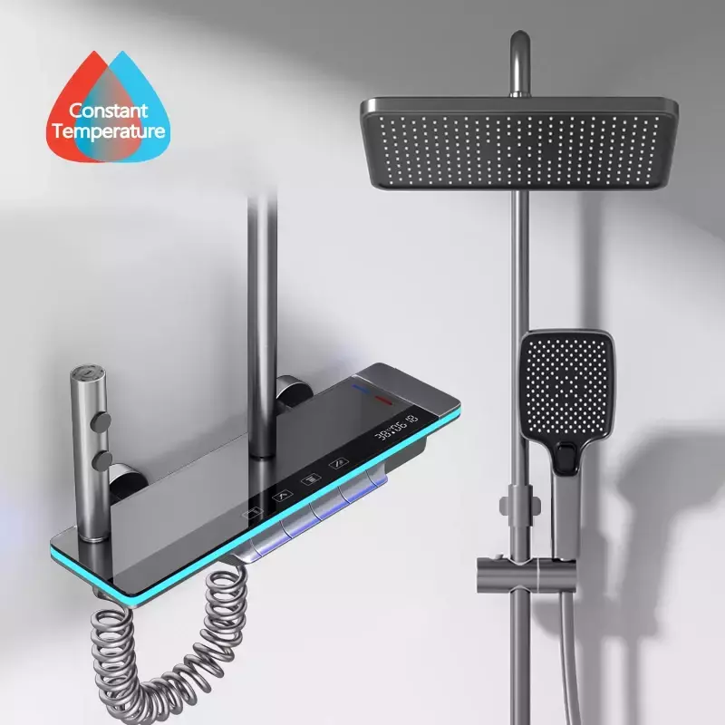 Material: grifo mezclador cobre acero inoxidable superficie vidrio templado.Material de acero inoxidable para barra de ducha, cabezal de ducha, material plástico ABS anti-quemaduras, material de manguera de PVC