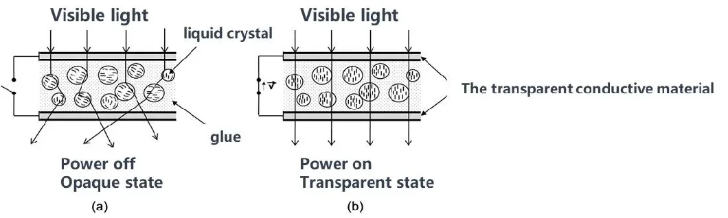 Principio de funcionamiento1.La función óptica de la película se realiza mediante las características ópticas del cristal líquido;2.El vidrio regulable controlado electrónicamente dentro de las moléculas de cristal líquido mostrará una distribución irregular;3.En este punto, el cristal de control electrónico presenta una apariencia translúcida y opaca;4.Después del poder, dentro de las moléculas de cristal líquido aparecen perfectamente dispuestas;5.La luz puede penetrar libremente y luego el cristal líquido controlado electrónicamente muestra un estado transparente.Diagrama de principio de funcionamiento: