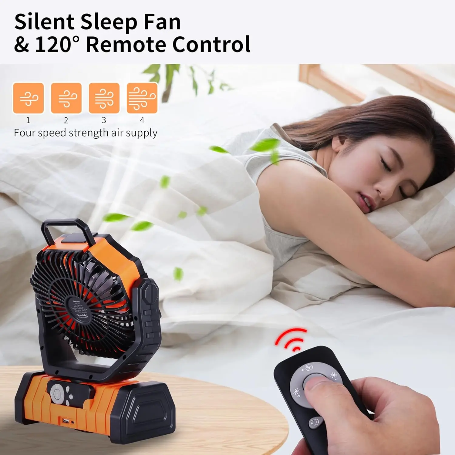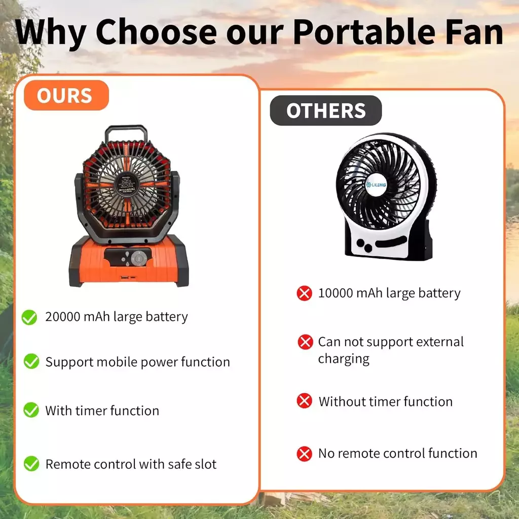 ?Luz LED súper brillante y control remoto ?Para los amantes del camping, nuestro ventilador esencial para acampar es sin duda su compañero esencial para el verano. Este ventilador para Exteriores cuenta con una luz compuesta por 32 cuentas de luz LED con 3 ajustes de brillo, por lo que es el compañero perfecto para sus aventuras al aire libre cuando cae la noche mientras acampa, se reúne o hace una barbacoa con amigos. El brillo más bajo de este ventilador de mesa es para leer, estudiar y pensar por la noche; El brillo más alto puede iluminar toda la tienda o el interior, ¡satisfacer sus diferentes necesidades!