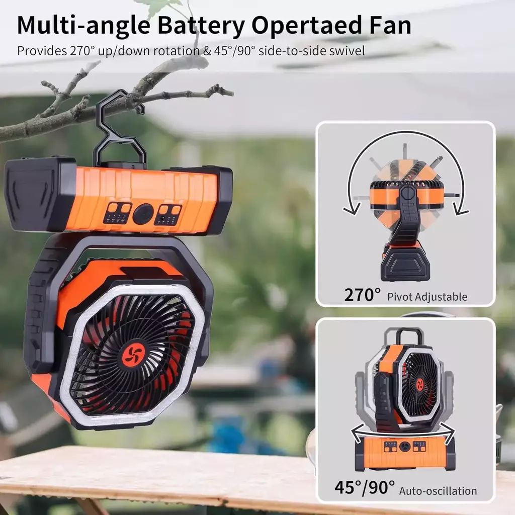 ?Oscilación automática y control remoto ?El ventilador de acampada admite oscilación automática de 90 ° o 45 ° a izquierda/derecha y rotación de 270 ° arriba/abajo para enfriarlo desde cualquier ángulo. Para su comodidad, también proporcionamos un control remoto adicional, puede usar el control remoto de manera flexible para ajustar las velocidades del ventilador de camping, la iluminación y la sincronización dentro de una distancia de 26 pies, sin dejar la comodidad de su asiento o cama. (Nota: Retire la tira de aislamiento del mando a distancia antes de su uso).